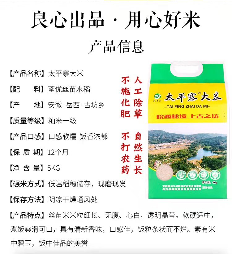 岳西县古坊乡“上坊村”水稻种植特点昼夜温差大,水稻种植周期150天以上,插秧比其他地方早半个月,收割稻谷迟半个月。有句谚语:“身上不绑三两棉,别到古坊来插田”意思插秧时,温度低。 太平寨大米 不施化肥 不打农药 人工除草 自然生长