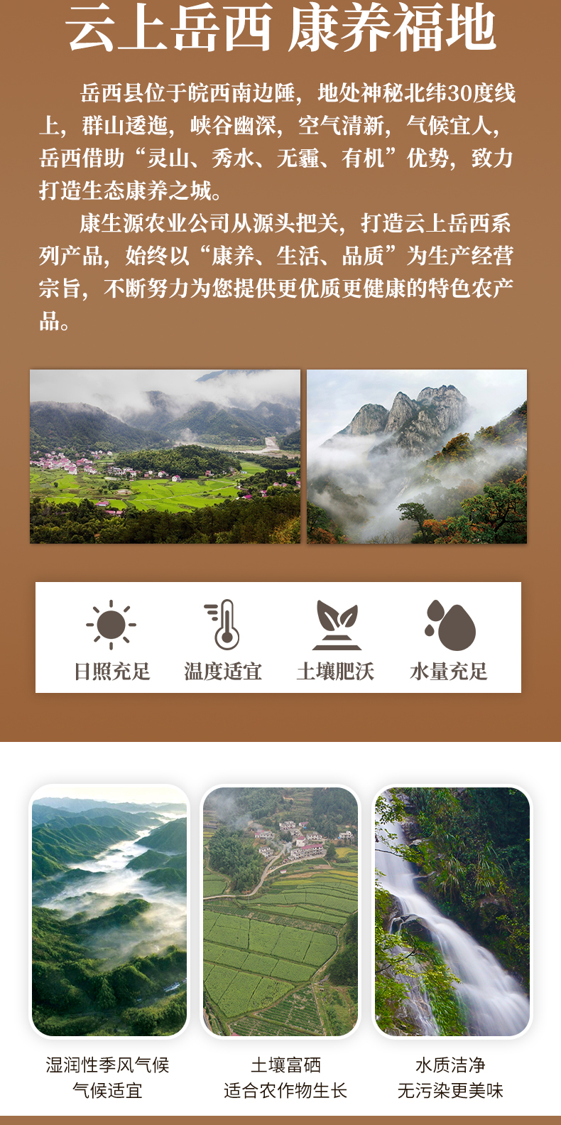 康生源农特优品,产品源自大别山腹地岳西县,主打产品为岳西翠兰、高山茶油、当地农特产品,我们始终坚持康养·品质·生活为宗旨,致力于打造感动人心的区域优良产品。