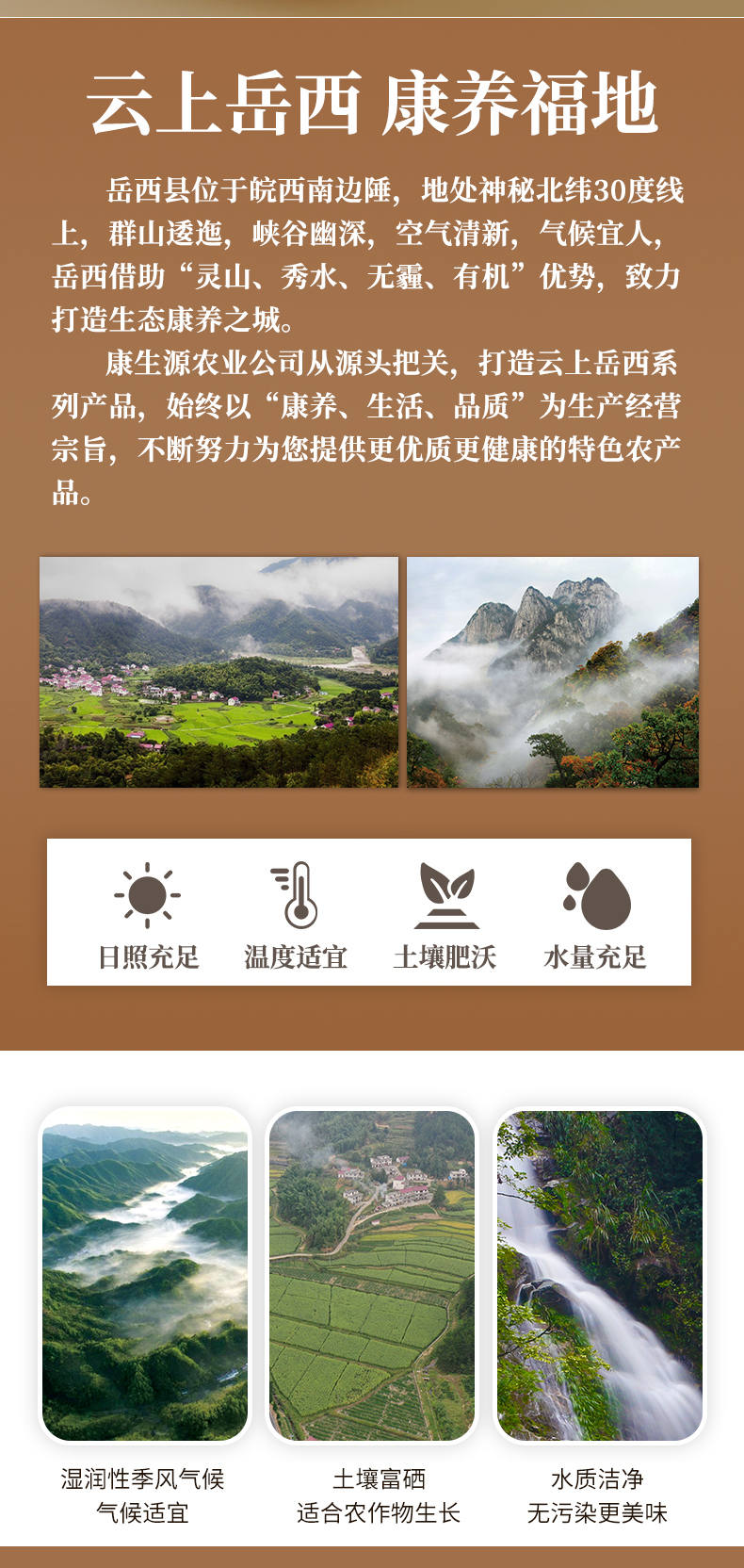 康生源农特优品,产品源自大别山腹地岳西县,主打产品为岳西翠兰、高山茶油、当地农特产品,我们始终坚持康养·品质·生活为宗旨,致力于打造感动人心的区域优良产品。